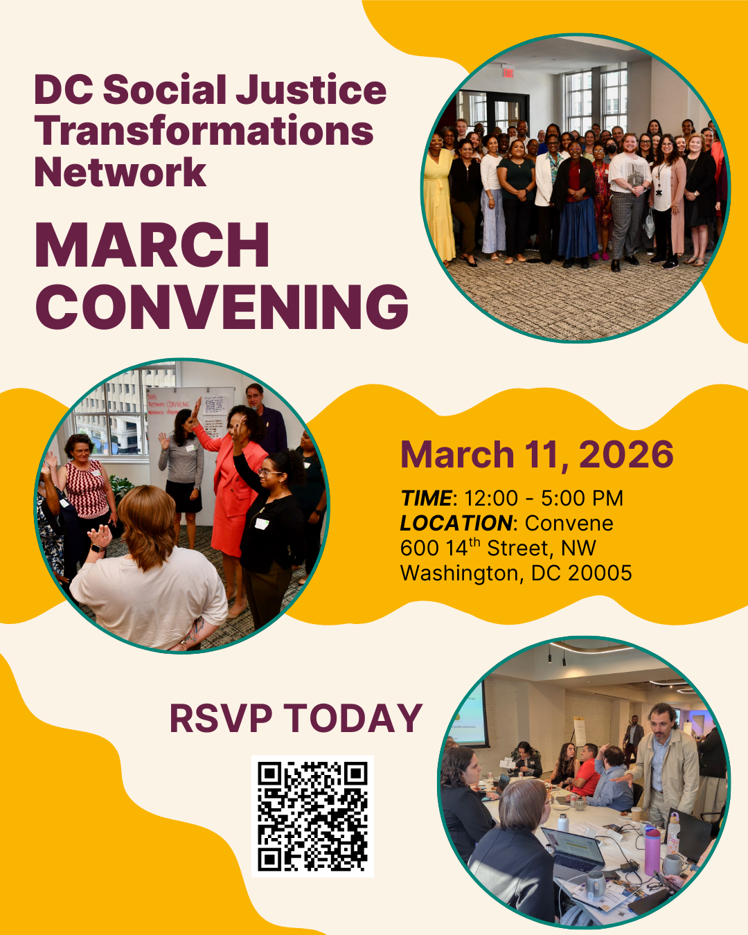 Back to All Events DC Social Justice Transformation Network’s Convening Wednesday, March 11, 2026 12:00 PM 5:00 PM Convene 600 14th Street Northwest Washington, DC, 20005 United States (map) Google Calendar ICS The DC Bar Foundation is holding the DC Social Justice Transformation Network’s Convening on Wednesday, March 11, 2026, from 12:00–5:00 PM at Convene, 600 14th St NW, Washington, DC 20005.