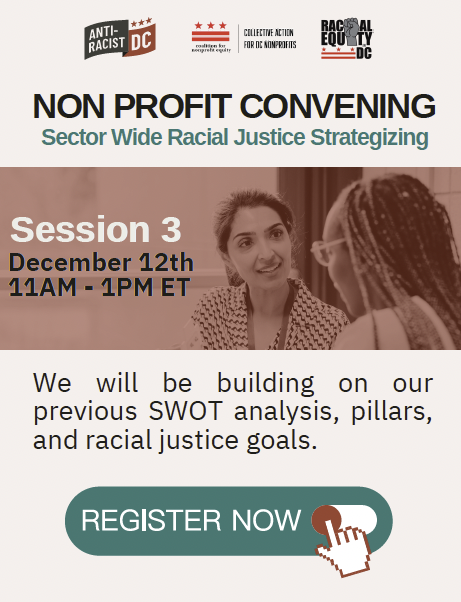 We're excited to invite you to our third Nonprofit Racial Justice Strategy Virtual Session on Friday, December 12 at 11am. This session follows up on our last two sessions where we completed a Nonprofit Racial Justice SWOT analysis and reviewed and edited the draft goals for the strategy.